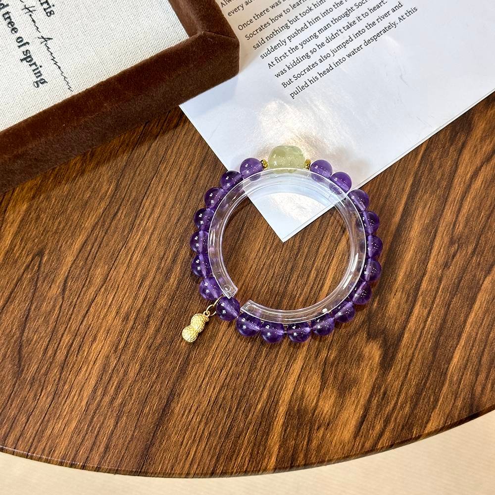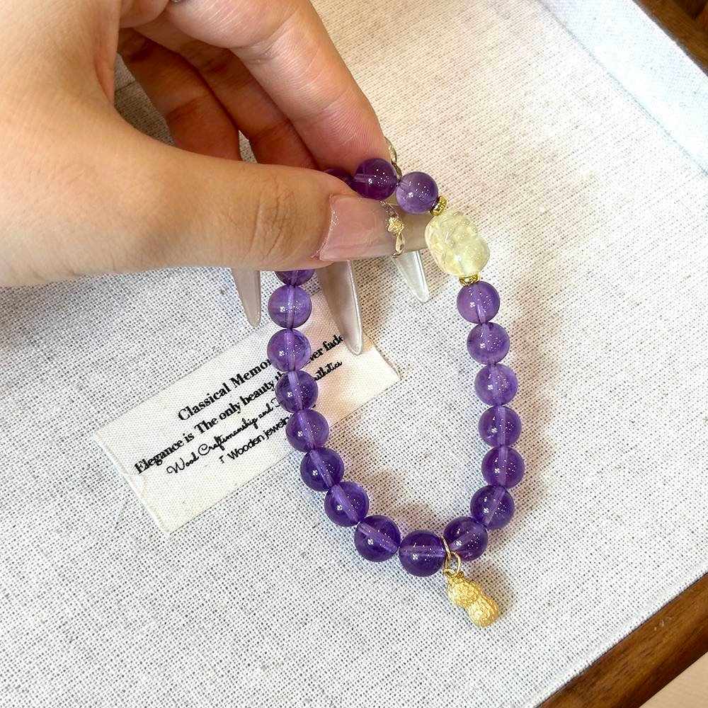 The rich purple hue of the Amethyst is like a sunset, awakening wisdom. The Pixiu glows a honeyed yellow, attracting wealth. The silver accessory sparkles with quality, gathering good fortune. The collision of purple and yellow is both vibrant and luxurious.