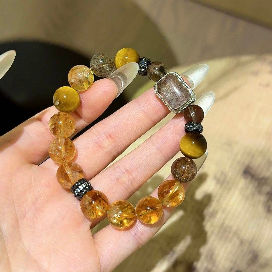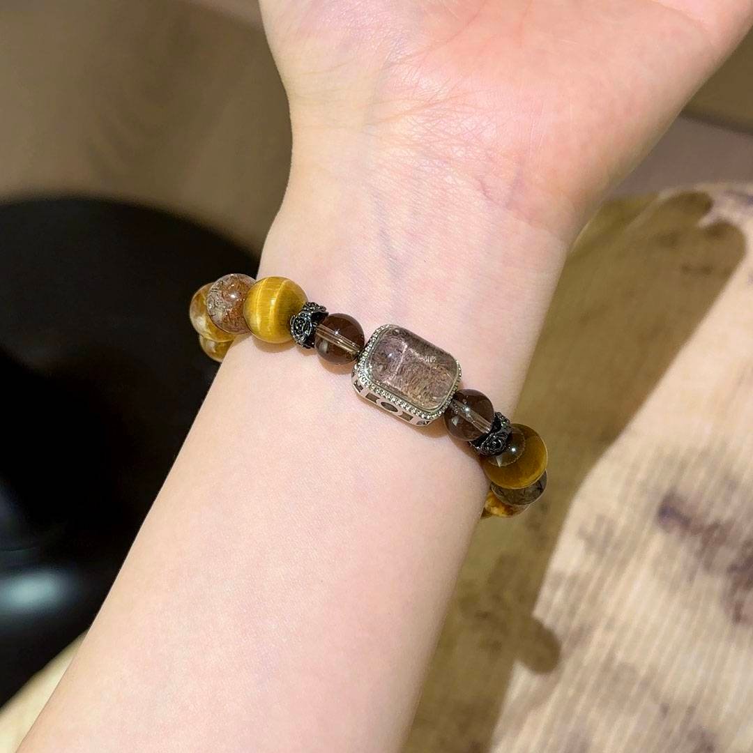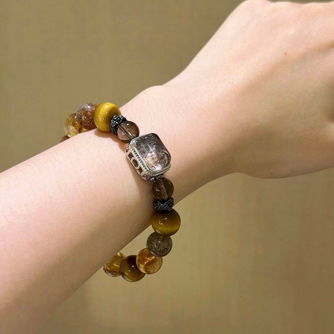 Gold Tiger's Eye, Yellow Rutile Quartz, and Black Gold Rutilated Quartz "Magic Box" Bracelet - Material: Gold Tiger's Eye, Yellow Rutile Quartz, Black Gold Rutilated Quartz, Smoky Quartz, Four Seasons Phantom Quartz. Size: 11-12mm