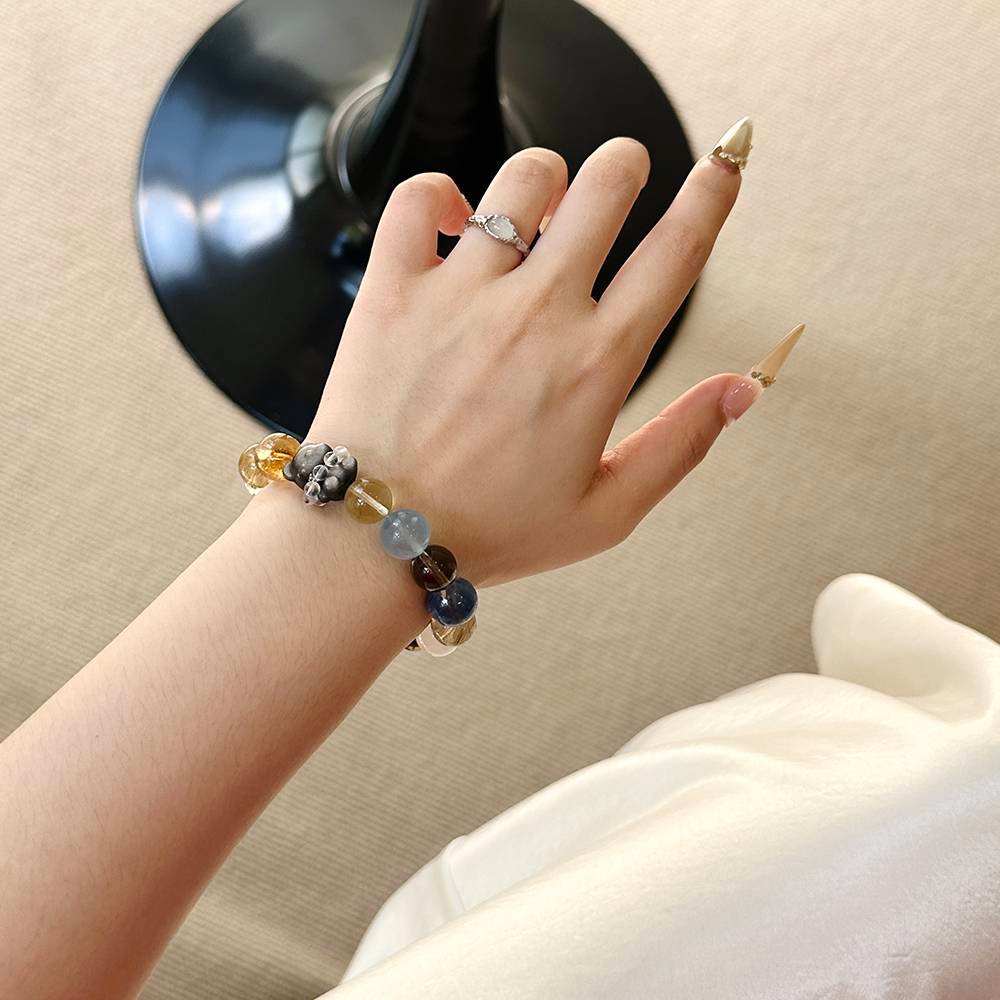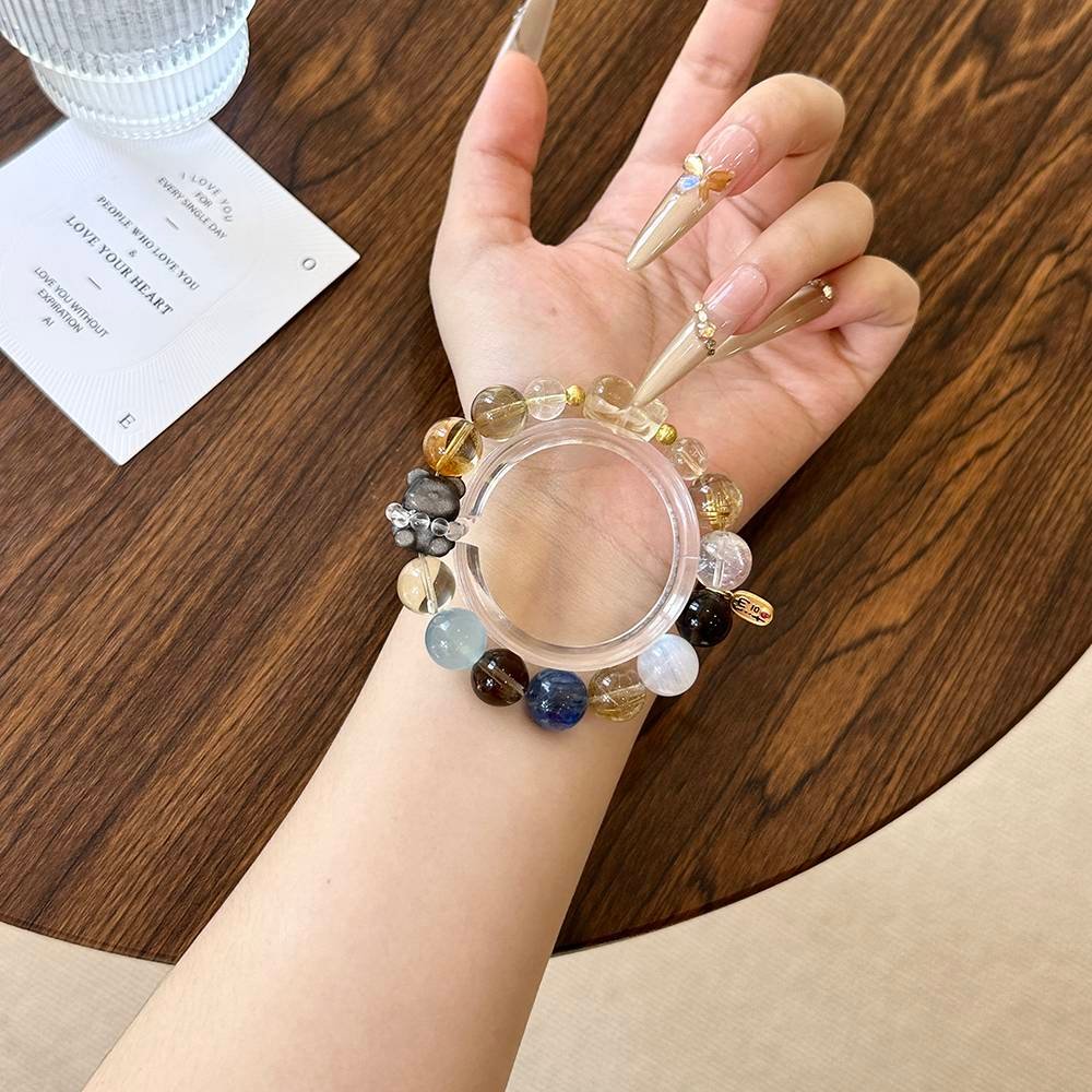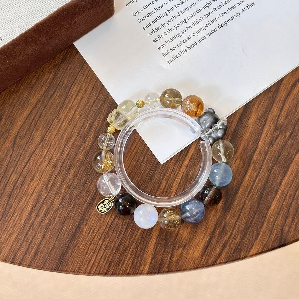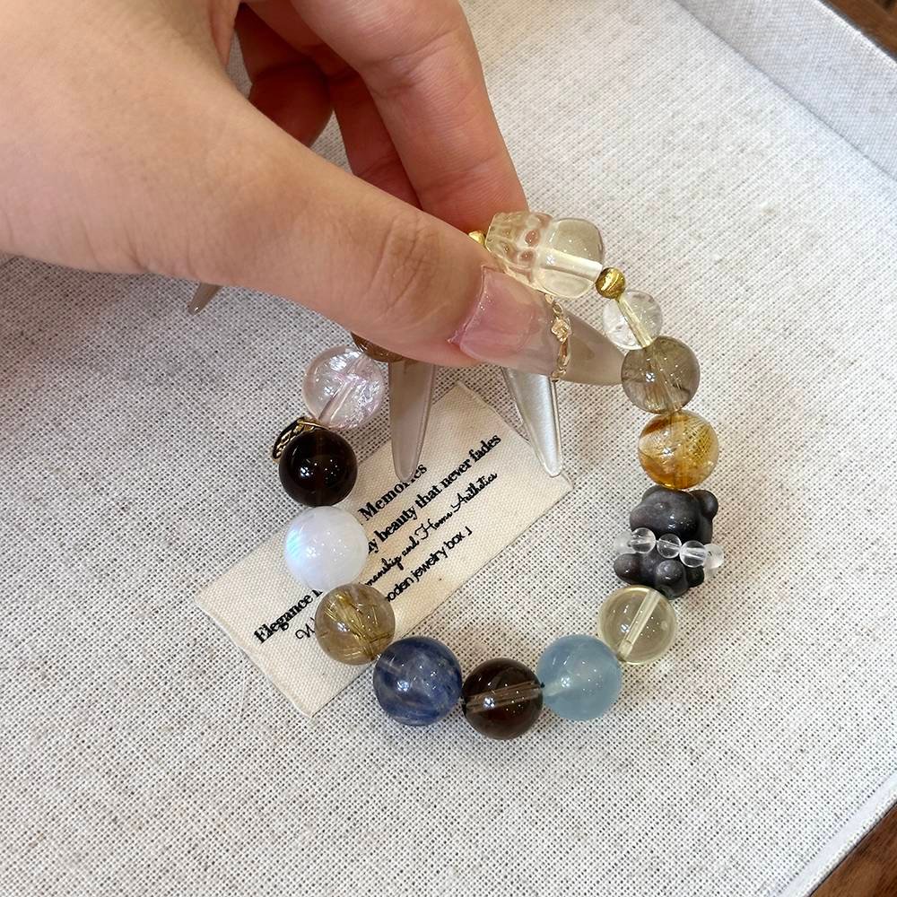 Golden Rutilated Quartz gathers wealth, Kyanite soothes emotions, Citrine boosts financial luck, and the Bear + Pixiu lock in good fortune! Wearing this is like carrying a “Lucky Sweet-Cool Pouch.” Sisters who want to be both wealthy and beautiful, go for it—whoever wears it gets chased by good fortune!