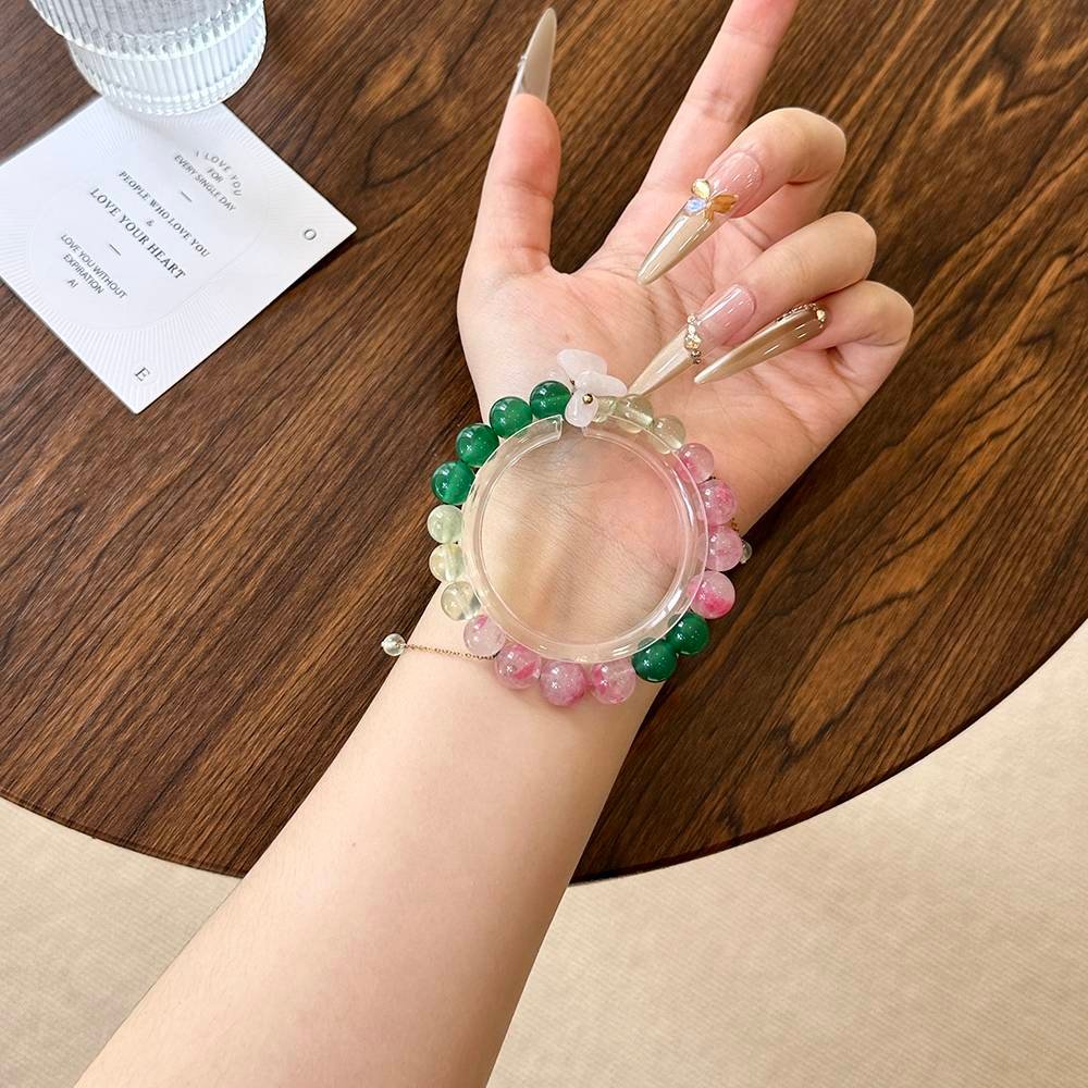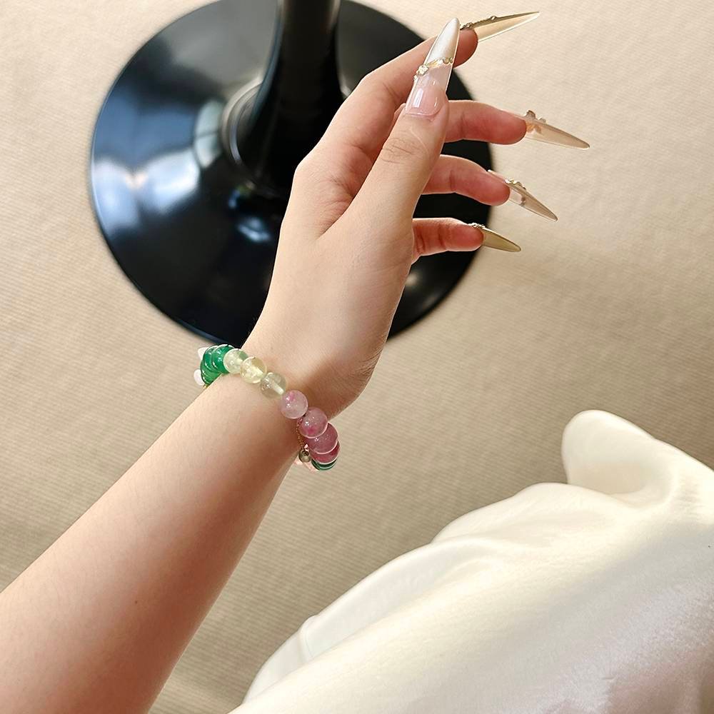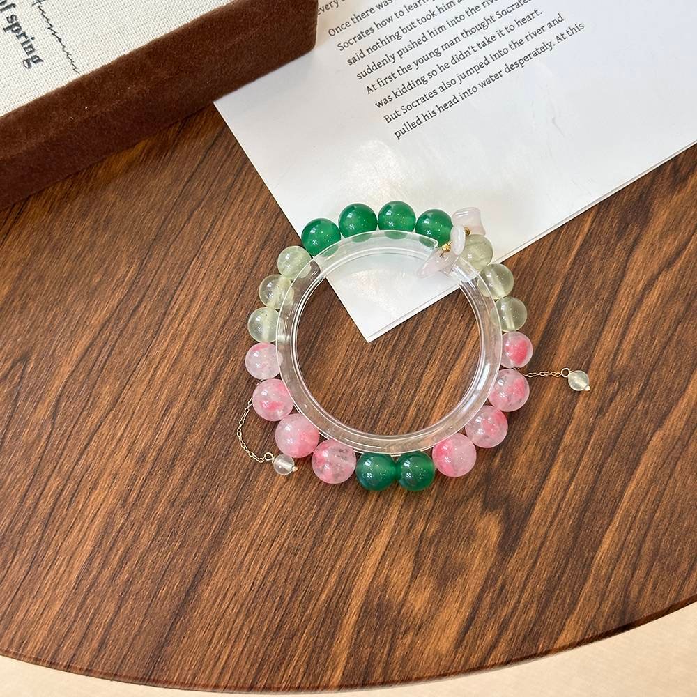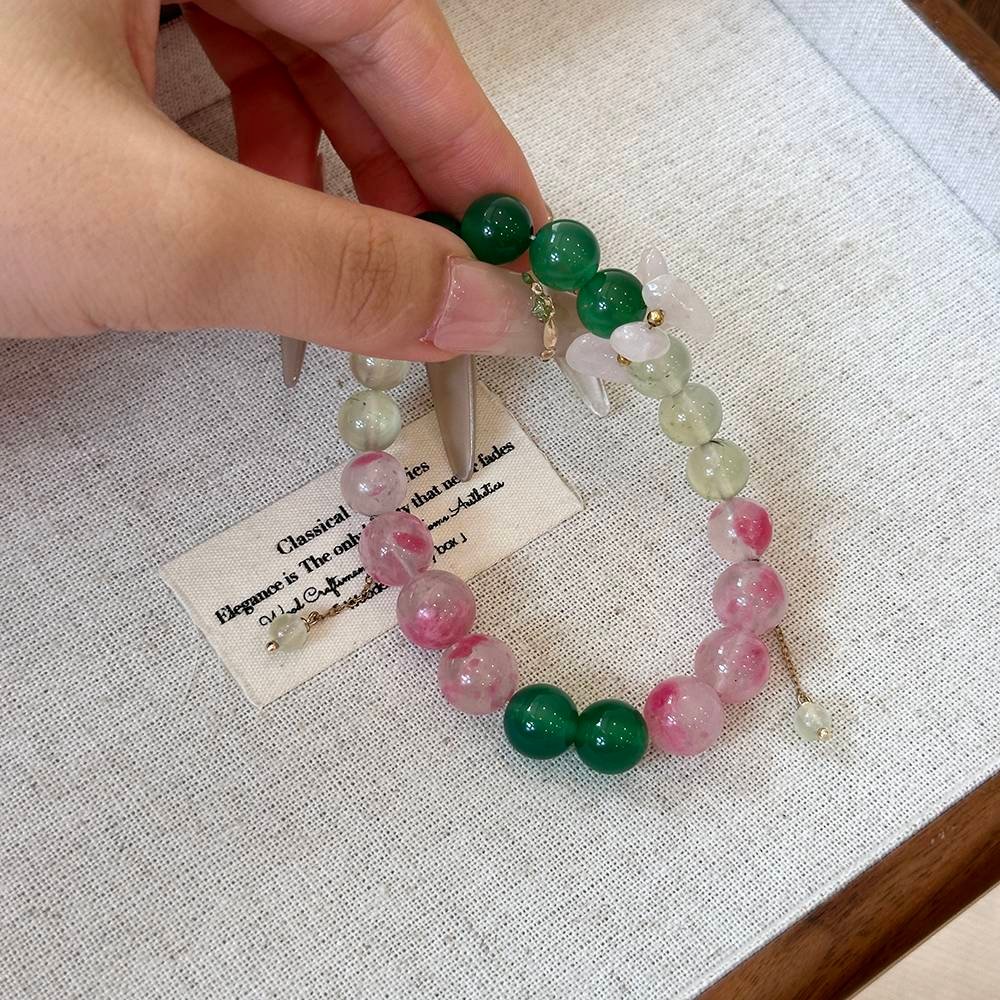 The gentle pink glow of the Rhodonite is like a strawberry milkshake, the clear green brilliance of the Prehnite is like dew-kissed leaves, and the vibrant sheen of the Green Agate makes your skin look incredibly fair. The collision of pink and green, flashing with light, seems to whisper, “I’m in love!”